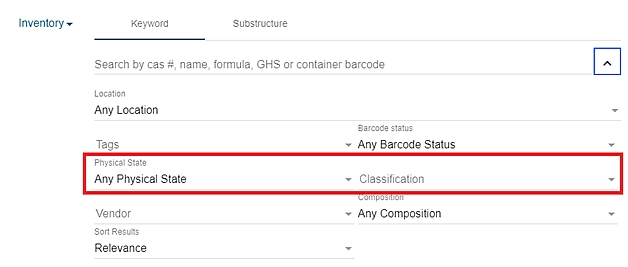 screenshot of UC Chemicals inventory search in UC chemicals platform. Used to search classification field and appropriate physical state.